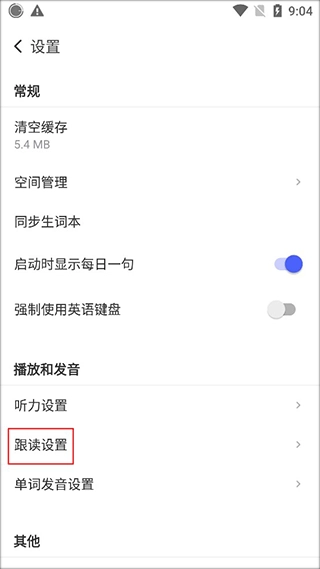 在【设置】界面的播放与发音区域里找到跟读设置选项,接着点击该选项。