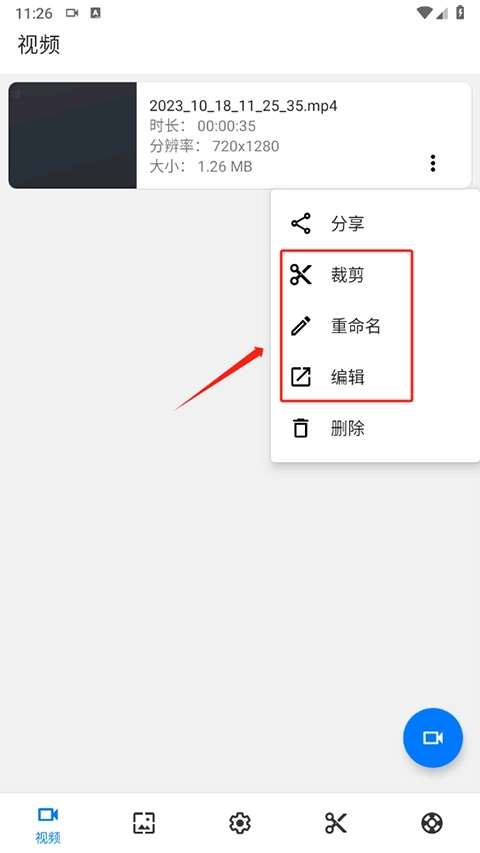 6、同时点击视频右边的三点还可以对视频进行裁剪、编辑、重命名等操作