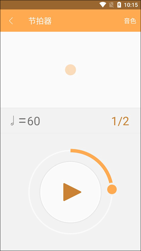 进入节拍器界面后,能看到醒目的播放图标,图标外围环绕着一个可调节的圆环。只需拖动圆环上的小球,就能调整节拍器的速度;速度设置好后,点击播放按钮即可自动播放节拍。此外,通过右上角的音色选项还能切换节拍器的声音,操作十分便捷。