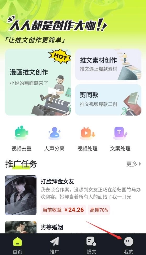 天天推文是一款实用的小说推荐视频生成工具,它的界面设计简约直观,功能全面且强大,核心目标是协助用户快速制作小说内容相关的视频。此外,软件还具备便捷的小说创作辅助功能,不管用户想生成何种类型、题材的内容,都能通过它轻松实现。同时,软件了高效的发布功能,用户完成制作后即可一键发布,有需求的用户可别错过这款好用的工具。