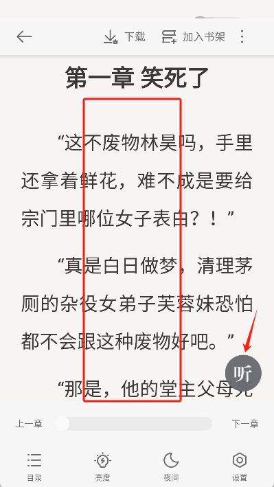4、在阅读界面点击屏幕中间可调出阅读设置,点击“听”按钮即可启动小说朗读功能。