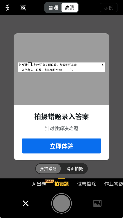 3、扫描试卷:点击“拍错题”功能按钮即可启动试卷扫描流程,操作时请尽量让试卷完整覆盖屏幕区域,这样能确保获取到清晰的扫描效果。