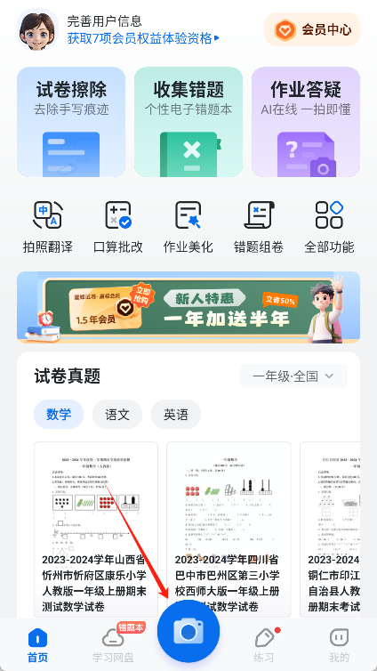 2、选择试卷:随意打开应用后,在主界面里找到底部导航栏的拍摄按钮并点击。