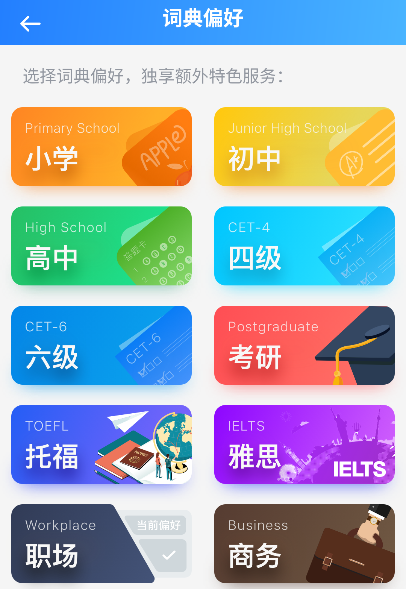 用户可以根据自身的学习目标,选择“职场商务、托福雅思、考研、四六级、初高中”等词典偏好设置,进而获得专属的词汇书与精讲内容。