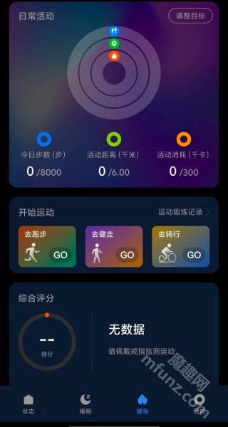 4、在健身界面能查看步数、距离和消耗的卡路里