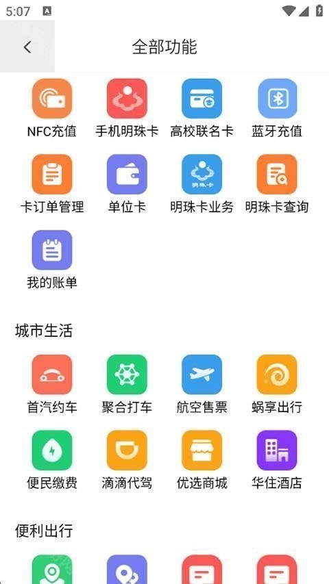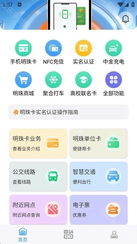 1、打开大连明珠卡应用,其首页整合了NFC、充电、商城、打车、手机明珠卡等丰富多样的生活服务功能。