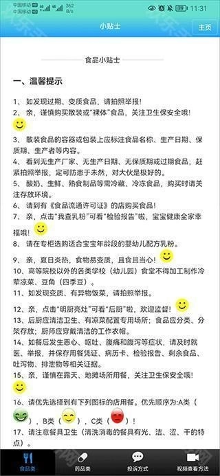 3、各类食品健康提示可随时查阅,以此学习食品药品安全知识。