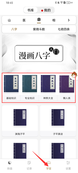 5、进入学堂页面后,这里有丰富的入门漫画和八字书籍供大家免费浏览学习,新手也能快速掌握入门知识。