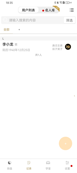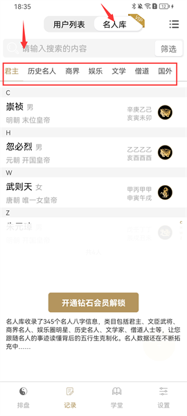 4、点击名人库,即可查看君主、历史名人、商界、娱乐、文学等不同领域名人的完整八字信息,通过上方的搜索框也能快速查找目标人物。