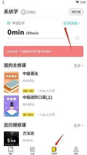 1、启动软件后,点击底部的“系统学”选项,接着点击“打卡详情”选项。