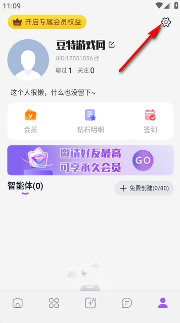 1、打开奶糖AI海外版后,进入个人中心界面,找到右上角的“设置”按钮。