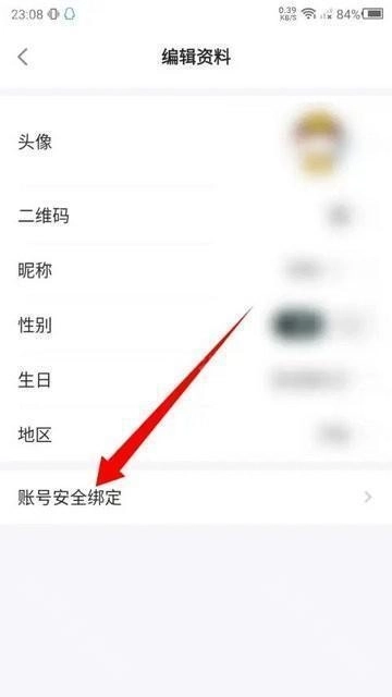 2、进入编辑资料页面,点击账号安全绑定选项。