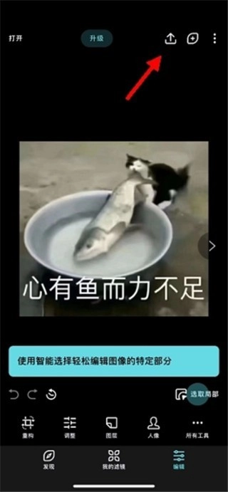 1、启动Polarr应用,找到要保存的照片所在界面后,点击界面右上方的分享图标。
