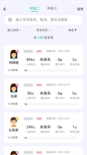 每位学员都有专属的完整档案,教练能随时查看从科目一到科目四的学习进度与情况,还配备了便捷的一键通话和一键发消息功能。