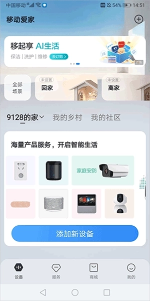 1、打开登录移动爱家后,在设备页面点击【添加新设备】