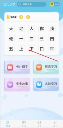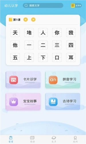1、进入幼儿认字应用后,可看到首页、英语、更多以及我的这几个版块,点击首页的相关内容就能开启学习;