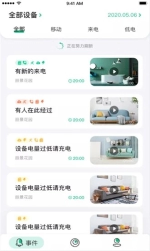 3、划分不同的事件提醒类别栏目,包括移动类、来电类和低电类栏目。