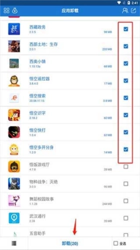 2、在右侧勾选需要卸载的应用,然后点击卸载;