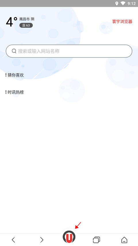 1、启动浏览器,进入首页后,点击页面底部中间位置的“u”。