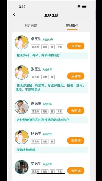 寻找各个科室的宠物医生并对宠物的健康问题进行咨询。
