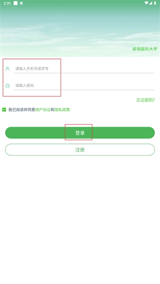 3、进入登录页面后,输入手机号或学号以及密码,勾选相关协议,然后点击【登录】按钮即可完成账号登录;如果没有账号,可点击【注册】按钮进入注册流程。