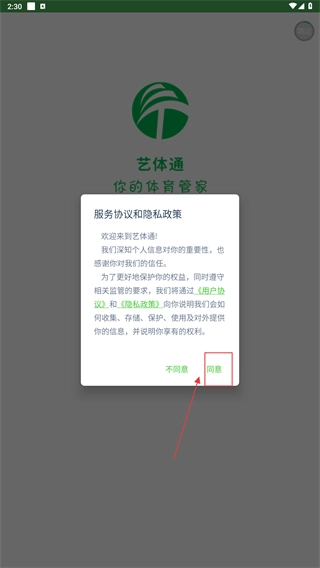 1、当弹出服务协议与隐私政策的窗口后,点击【同意】按钮以确认接受相关条款,随后即可进入应用的学校选择步骤。