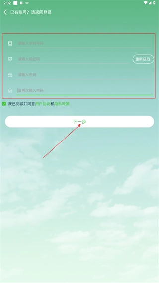 4、进入注册页面后,请按顺序填写手机号码,获取并输入验证码,设置密码(需再次确认密码),勾选相关协议,最后点击【下一步】按钮,即可完成账号注册流程。