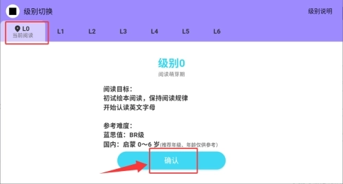 3、选择对应学习级别如L0进入阅读界面。