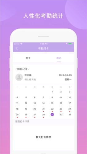 设有部门考勤统计板块,方便用户查看所在部门的详细考勤信息,以便快速了解情况。