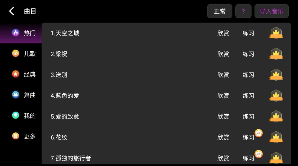 4. 曲库选择:软件内收录了丰富的热门与经典曲目,用户既能点击欣赏,也可进入练习模式,通过边听边学的方式提升演奏能力。