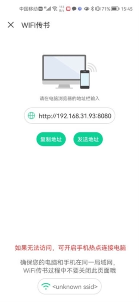 4、若选择WiFi传书,需确保电脑与手机处于同一局域网,传书期间请不要关闭当前页面;若遇到无法访问的情况,可开启手机热点让电脑连接。