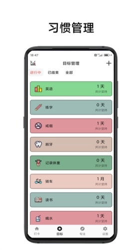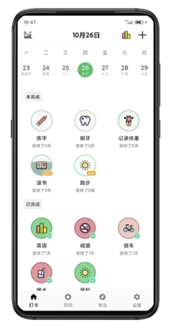 在应用的主界面或“统计”页面中,您可以查看每个目标的打卡统计信息,如连续打卡天数、已打卡次数、未打卡次数等。