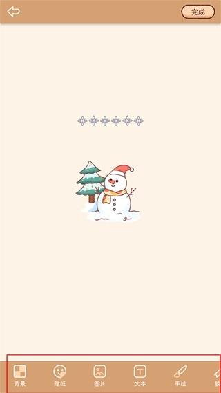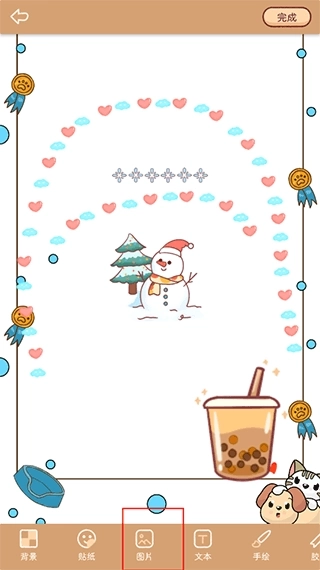 2、手帐制作页面的下方配备了背景、贴纸、图片、文本、手绘等丰富功能,点击进入相应功能模块后,更有海量素材可供选用,助力你轻松创作心仪的手帐作品。