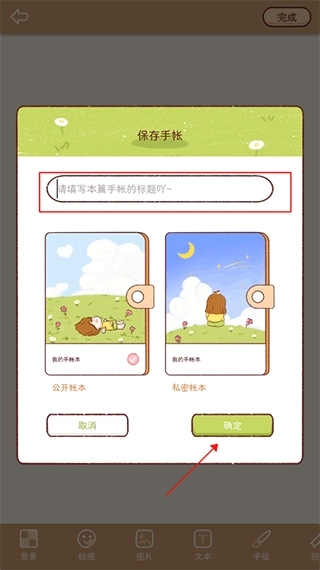 3、手帐制作完成后,点击右上角的保存按钮,设置好手帐标题后点击“确定”就可以了。