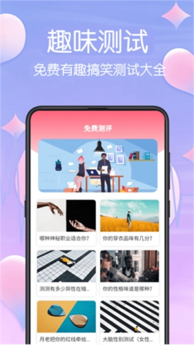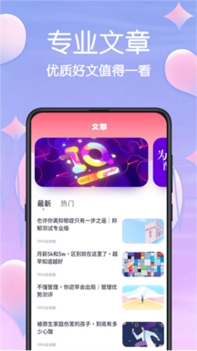 【测评类型丰富】多类免费心理健康测评,有关乎职场的职业性格测评、职场竞争力测评,有发掘你的人格魅力的人格魅力评估、智商检测器;还有为你提供专业的测评文章。