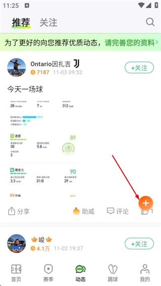 2、在动态页面,若要发布新动态,点击页面上的“+”按钮,即可进入动态发布页面。