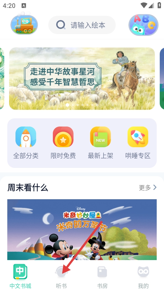 1、在底部的功能栏里,点击【听书】这个选项,就能进入听书页面了。