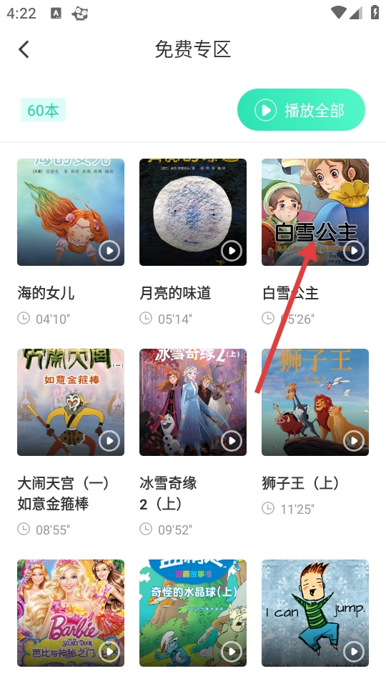 3、在免费专区的列表页面里,找到你想收听的内容,比如选择【白雪公主】这个条目,就能进入对应的听书播放页面了。