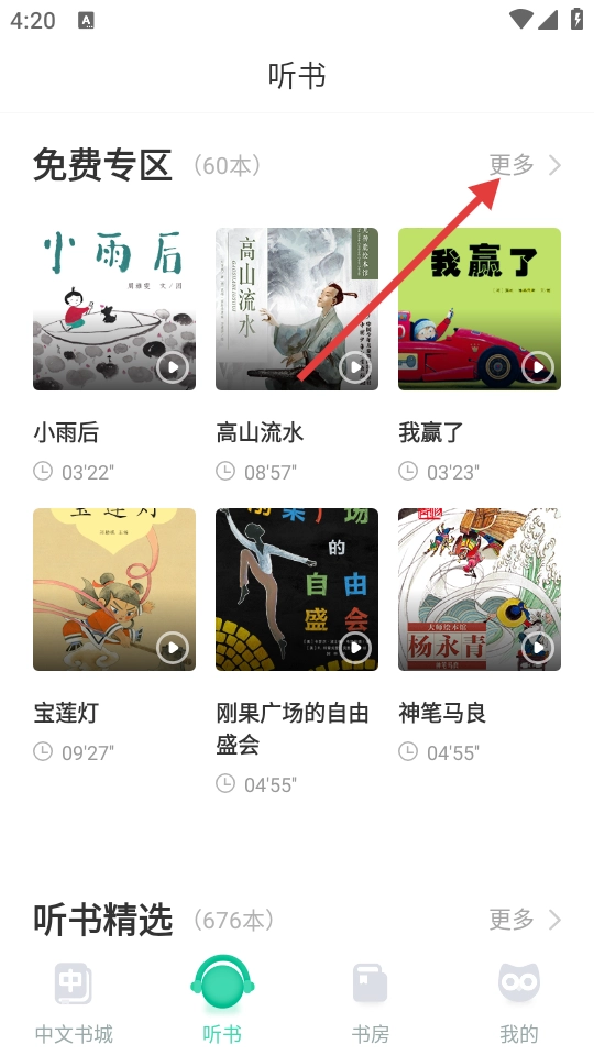2、进入听书页面后,找到【免费专区】板块,点击其右侧的【更多】按钮,即可跳转至免费专区的列表页面。