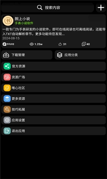 3、向左滑动即可进入功能中心,这里提供了管理、应用分类、资源广场等多种功能