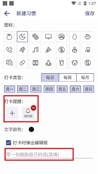 3、明确你的打卡任务,选定打卡提醒时间,也能编写一句激励自己的话语;