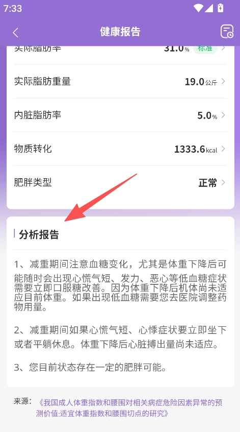 3、进入健康报告页面,查看分析报告内容,从而获取减重等方面的健康建议。
