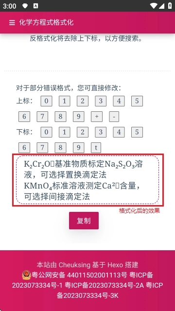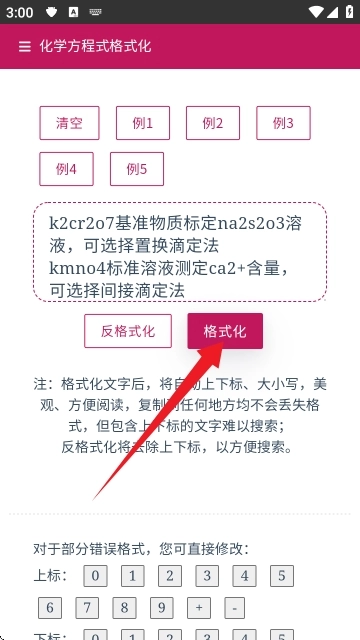 4:以“化学方程式格式化”功能为例,进入对应的工具界面后,在输入框内填写化学方程式的具体内容,随后点击“格式化”按钮,就能将输入的内容转换为标准格式。