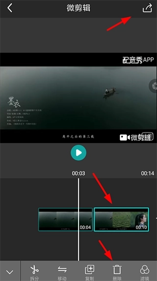 3、视频完成拆分后,用户还需删除其中不需要的视频片段,最后点击右上角的分享按钮导出作品即可!