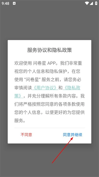 1、在阅读服务协议和隐私政策后,点击弹窗中的同意,并继续进入应用。