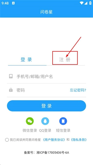 2、随后我们可以在问卷星登录页,点击注册选项,进入注册页面填写后续操作。