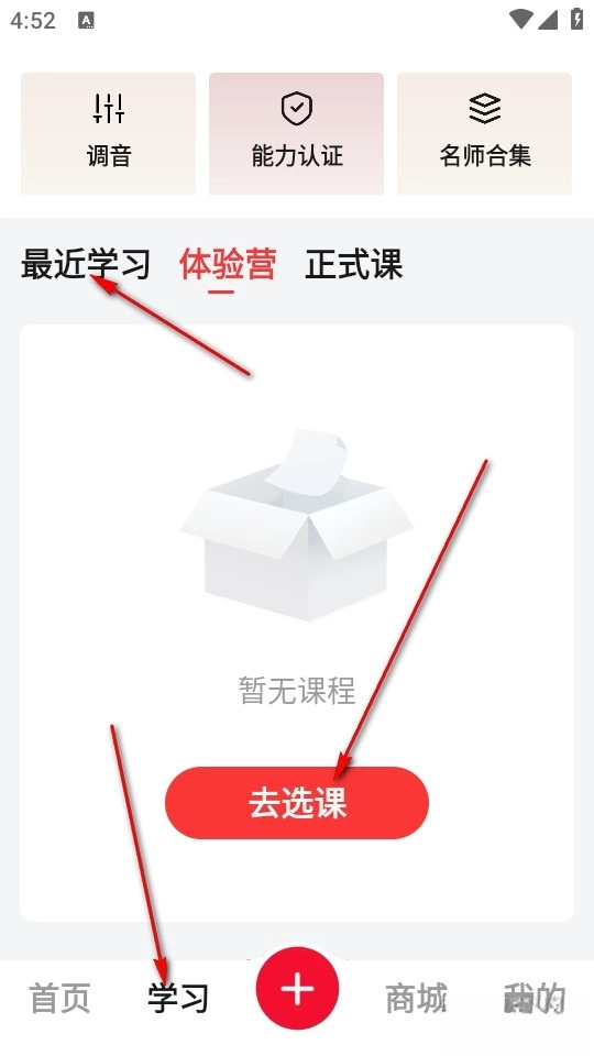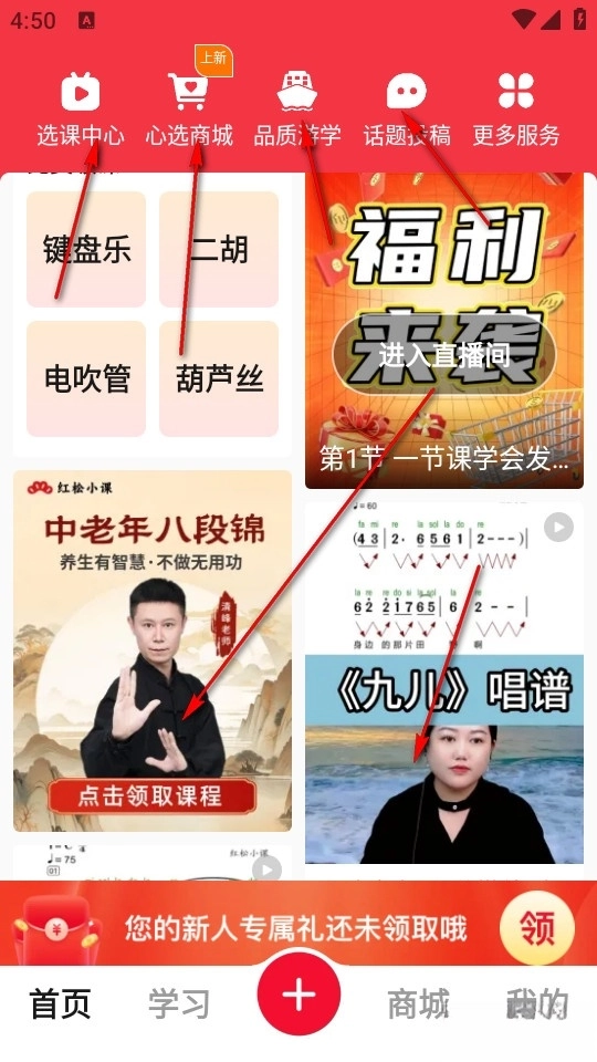 我们在首页能够看到软件内的许多功能例如学习小课、视频课程体验、游学等,用户可根据自己兴趣点击浏览。