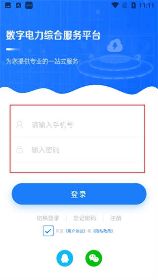 1、在【数字电力综合服务平台】登录界面,填写【请输入手机号】【输入密码】,点击【登录】进入平台。