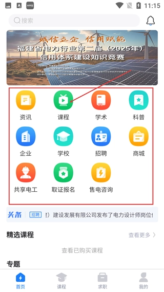 2、登录系统后,在首页的功能区域找到并点击【课程】入口,进入课程相关页面,即可选择各类电力相关的课程服务。