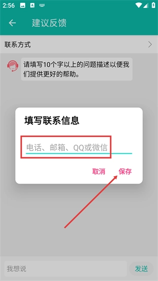 3、在建议反馈界面,点击“联系方式”栏,可打开联系信息的填写弹窗,补充沟通渠道信息。